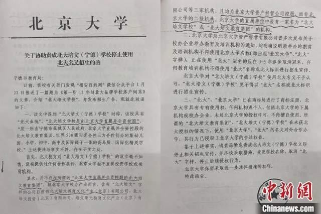 在今年8月,北京大学再次发函至宁德市人民政府,表示后者辖区内的民办学校——“宁德北大培文学校”的名称中包含该校校名简称,且对方未经授权,在网站域名或宣传中使用该校注册商标(“北京大学”“北大”“PKU”)等可能致使公众误解的内容和文字,应限期予以规范、更名。