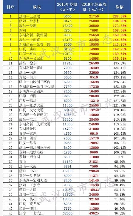 2015-2019年武汉各板块房价涨幅出炉!这板块竟然上涨288%...