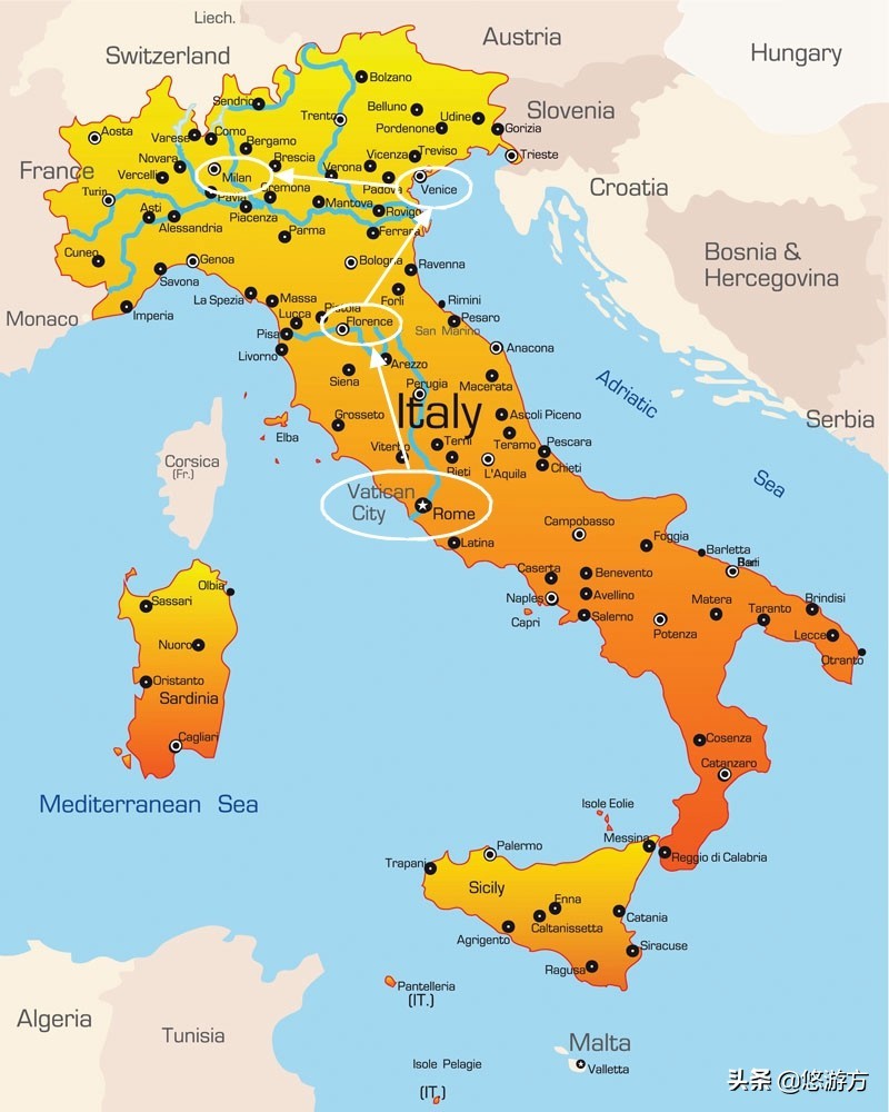 从景点、住宿、交通安排等难易程度考量,我为第一次去意大利自助游的朋友推荐一条经典路线,从罗马开始,一路向北,途经佛罗伦萨和威尼斯,最后从米兰返回。