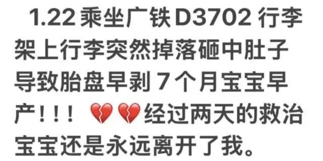 近日,网友张女士在社交媒体上反映,1月22日自己在动车上被突然掉落的行李箱砸中腹部,导致7个月的孩子早产离世。