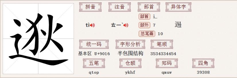 “祖逖”的“逖”读作【tì】,部首为辶,半包围结构,共十笔,笔顺为3534334454