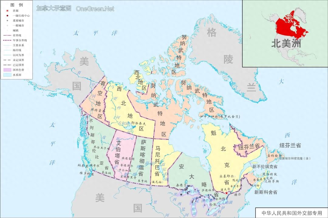 加拿大面积为998万多平方公里,居世界第二位,其中陆地面积909.3507万平方公里,淡水覆盖面积89.1163万平方公里。位于北美洲北部(除阿拉斯加半岛和格棱兰岛外,整个北半部均为加拿大领土)。东临大西洋,西濒太平洋,南接美国本土,北靠北冰洋。西北与美国的阿拉斯加州接壤,东北隔巴芬湾与格陵兰岛相望。海岸线约长24万多公里。东部为丘陵地带,南部与美国接壤的大湖和圣劳伦斯地区,地势平坦,多盆地。西部为科迪勒拉山区,是加拿大最高的地区,许多山峰在海拔4000米以上。北部为北极群岛,多系丘陵低山。中部为平原区。最高山洛根峰,位于西部的洛基山脉,海拔为5951米。加拿大是世界上湖泊最多的国家之一。因受西风影响,加大部分地区属大陆性温带针叶林气候。东部气温稍低,南部气候适中,西部气候温和湿润,北部为寒带苔原气候。北极群岛,终年严寒。中西部最高气温达40℃以上,北部最低气温低至-60℃。