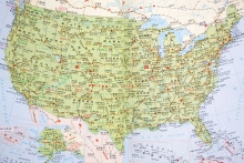 美国位于北美洲中部,领土还包括北美洲西北部的阿拉斯加和太平洋中部的夏威夷群岛。北与加拿大接壤,南靠墨西哥湾,西临太平洋,东濒大西洋。面积约为937万平方公里,本土东西长4500公里,南北宽2700公里,海岸线长22680公里。大部分地区属于大陆性气候,南部属亚热带气候。中北部平原温差很大,芝加哥1月平均气温-3℃,7月24℃;墨西哥湾沿岸1月平均气温11℃,7月28℃