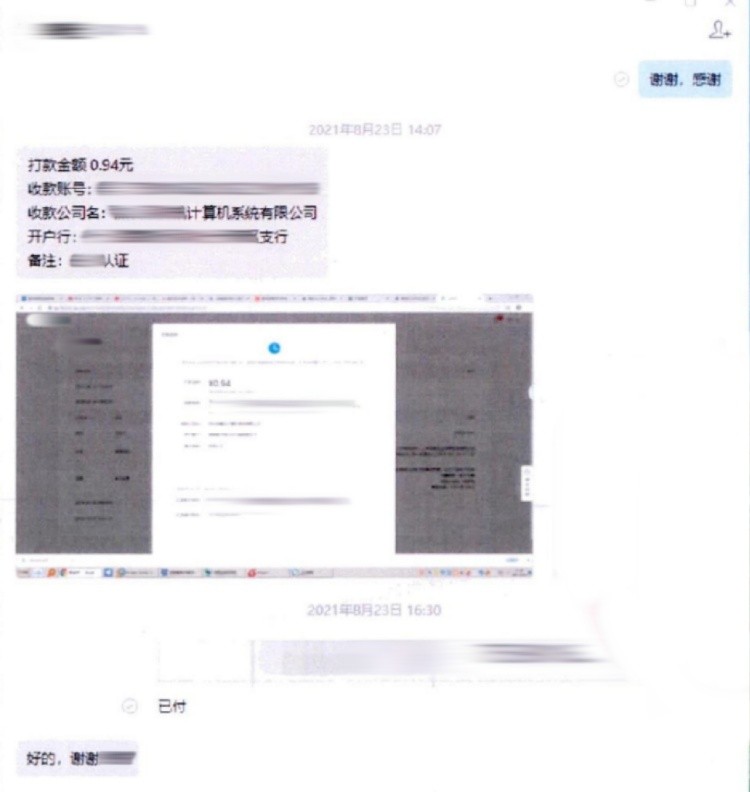 要想将商户号同企业微信相关联,需要公司将一笔钱打入平台指定账户中进行身份验证,验证完成后会进行退款。恰逢当时商户号到了年审时间,马瑞便以此为借口,请公司财务人员转账进行验证,但事实上这并不是年审的必需流程。