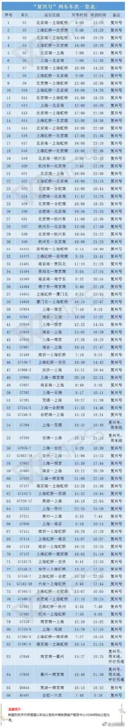 转需! @上铁资讯:上铁提醒【你要的“复兴号”列车车次在这里】今天起,长三角铁路将实施新的列车运行图,“复兴号”列车开行数量将增加近1倍,小编双手奉上调图后“复兴号”列车车次表!!