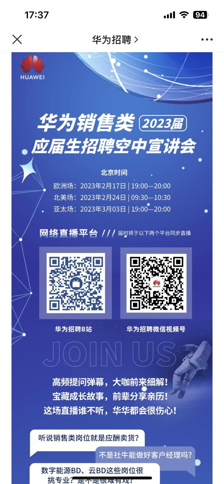 今天晚上19:00-20:00,华为2023届销售类应届生招聘空中宣讲会(欧洲场)在“华为招聘”官方微信公众号上进行。接下里的2月24日9:30-10:30、3月3日19:00-20:00举行北美场、亚太场两场华为销售类2023届应届生招聘空中宣讲会,招聘对象为国内2023.1.1-2023.12.31(今年)期间于国内高校毕业的应届生,以及2022.1.1-2023.12.31(去年及今年)期间于海外高校毕业的应届生。