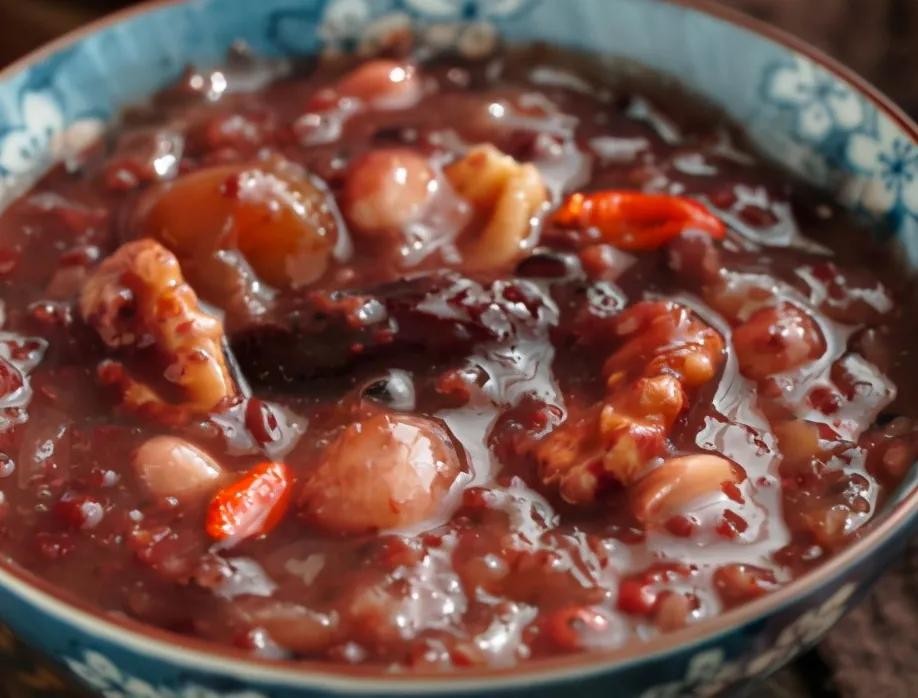 第四步,继续煮半个小时的时间,红小豆和莲子便也都能煮熟了,这个时候将事先用水泡过的枸杞放入,同时根据个人的口味嘉善冰糖或者白糖;