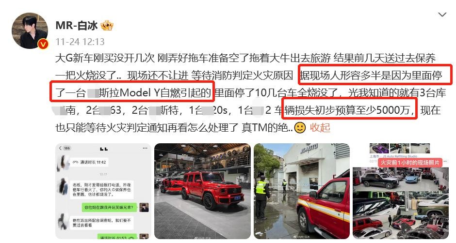 网红白冰豪车被烧!疑某斯拉自燃,致改装车行发火灾损失超5000w