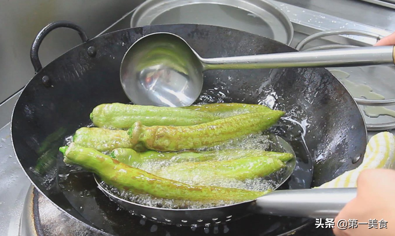 3.下面把青辣椒用油炸一下