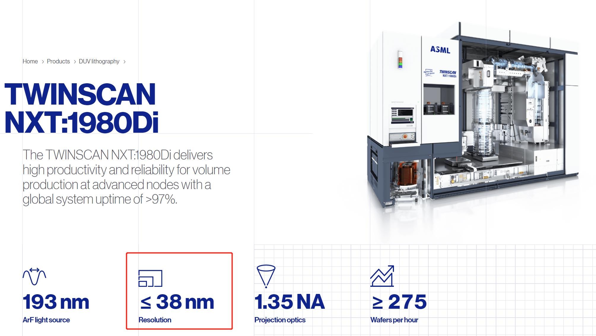 如上图所示,这是ASML官网上关于这一台TWINSCAN NXT:1980Di的介绍,其中在分辨率方面,写到是大于等于38nm。
