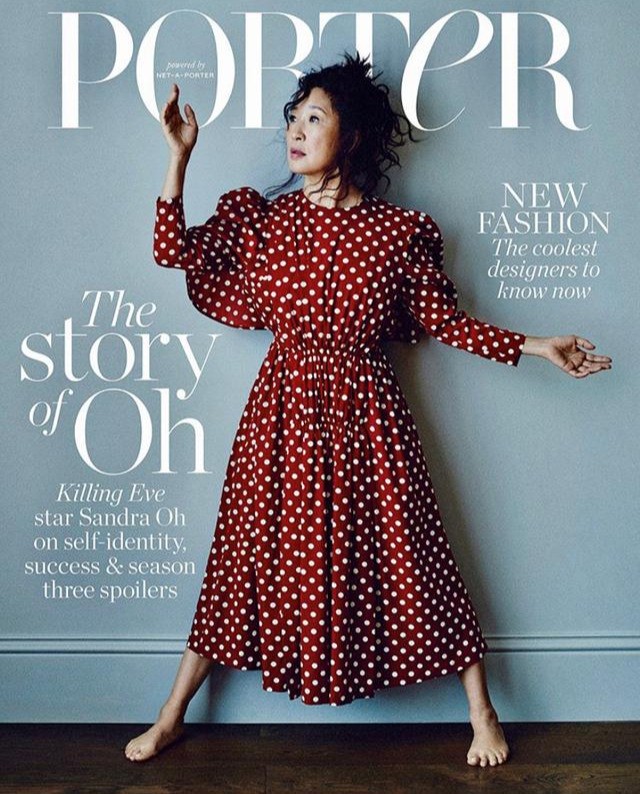 吴珊卓作为《杀死伊芙》的女主角之一,她在戏外的穿着也是非常可圈可点的。看这一张宣传硬照,她身着暗红色的波点连衣长裙,双肩有垫肩的设计,看上去更有气场。中间收腰的设计勾勒出了腰线,虽是宽松版型的长连衣裙但是却没有显得累赘拖沓。她脚上不着寸缕,光脚走在地上,这一方面会更好地体现出她在剧中的独立自主,不受束缚的人物形象。