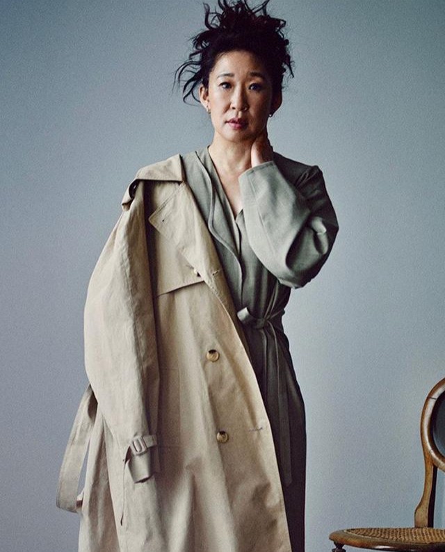 这一张照片里,她内穿一件灰绿色睡袍式设计的长款大衣,面料看上去柔软有光泽,为这身装扮增添了不少舒适性。而外面又搭配了一件相对而言硬朗派风格的棕黄色长款风衣,也十分契合她剧里的人物设定,果敢敏锐。发型是凌乱而不失层次美感的小卷发,十分符合她的人物风格。