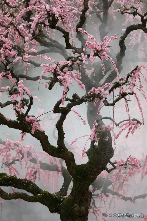 只见一株株排列整齐的龙梅枝条如雨伞状,向四周撑开垂悬,花朵缀满枝头,远望如粉色瀑布飞泻,近观似星河倾落。此刻的龙梅,既有“柔能克刚”的坚毅,又带着“零落成泥碾作尘,只有香如故”的清寒,恰似一位身着素衣的仙子,伴着薄雾翩翩起舞。望着这龙梅,我的心仿佛也被那缕缕清香浸润,变得无比宁静。