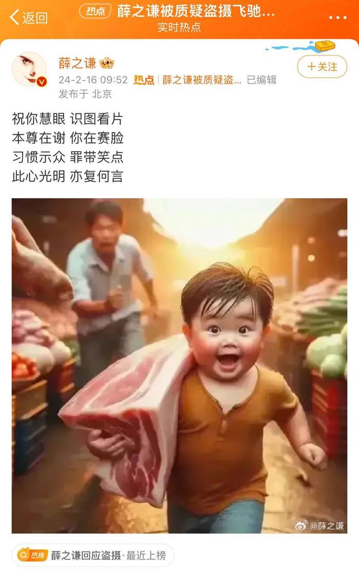2月16日,薛之谦作一首“打油诗”,疑似回应“盗摄”问题:“祝你慧眼,识图看片。本尊在谢,你在赛脸。习惯示众,罪带笑点。此心光明,亦复何言。”对于他的最新微博,很多粉丝留言安慰,表示此举是帮朋友宣传电影,“你没错”。但也有网友不解吐槽“盗摄还光明”?