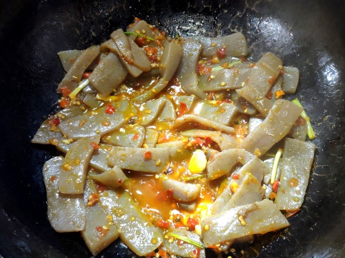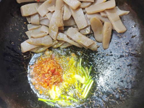 二,魔芋豆腐炒干水后拨过锅的边上,放练过的猪油,油热微冒烟后放蒜米、葱白、糟辣爆香: