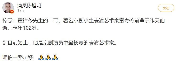 童寿苓去世后,除了他87岁的弟弟发文悼念之外,演员陈旭明也发文哀悼。陈旭明夸赞道:“到目前为止,他是京剧演员中最长寿的表演艺术家。”字里行间都充满着不舍之情。