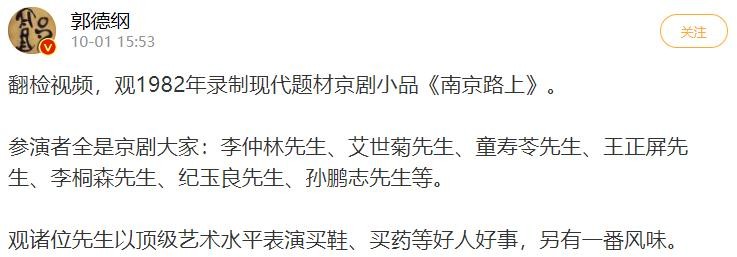 童寿苓在京剧领域是德高望重的前辈,他的代表作有《花田错》《红娘》等,获得过很高的荣誉。此前郭德纲还称赞童寿苓是京剧大家,两人私下也有合作,关系相当好。