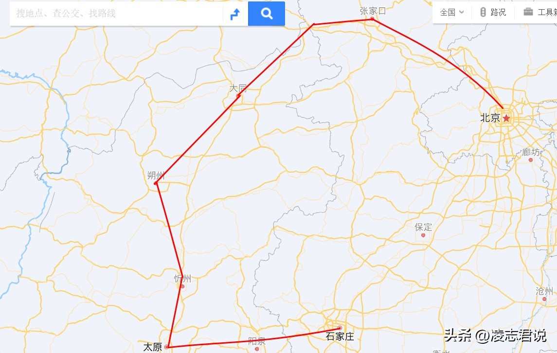 由于石家庄至张家口之间没有直达高铁线路,过境北京也是难度极大,本次开行只好绕道山西,从地图上看,大致如下: