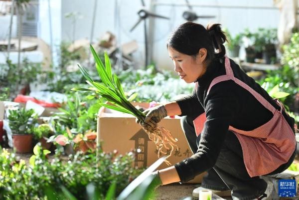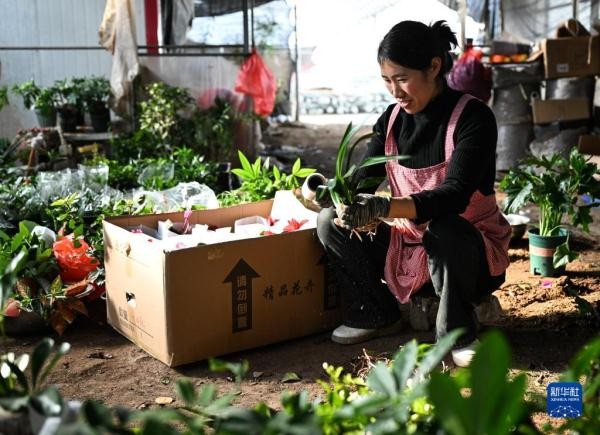 11月16日,在沭阳县颜集镇堰下村幸福花海电商直播基地,花农在包装花苗。