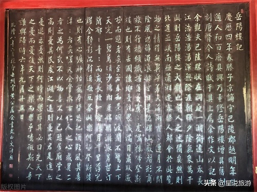 可以说,岳阳楼不纯粹只是一座楼台,更是一种厚重的文化积淀,同时也是一部让人百读不厌的史书。在岳阳楼上,有12块檀木板组成的木雕屏篆刻着《岳阳楼记》全文,各种对联悬于四壁,长的有百余字,短的只有8个字。这些字包含了中国传统知识分子忧国忧民的情结,是中华民族的精神楷模,也是后来人为之学习和奋斗的目标。