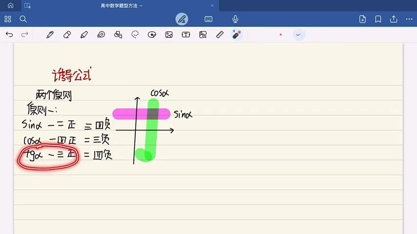 1. 第一个原则:原则一就是要知道三种三角函数在四个象限的正负分布情况。知道正弦在一二象限为正,三四象限为负。余弦在一四象限为正,二三象限为负。正切在一三象限为正,二四象限为负。可以画出坐标系,在坐标纸上标明三种三角函数的正负情况。正弦在一二为正,三四为负,于是在坐标纸上可以做出标记。这一横表示正弦,画在一二象限表示正弦在一二为正,三四为负。同样的余弦在一四为正,二三为负,在坐标纸上可以标出来。这条竖勾表示余弦,画在一四象限表示一四象限余弦为正,二三余弦为负。同样的正切在一三象限为正,二四为负,于是可以做出标记。这一撇表示正切,正切在一三象限表示正切在一三象限为正,二四象限为负。