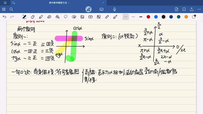 3. 理解完两个原则以后还需要一句口诀,就是奇变偶不变符号看象限,其中这个地方的奇和偶表示与阿尔法相加相减的那个角是二分之π的奇数还是偶数倍。这个变还是不变,对应的是三角函数名的变化情况。三角函数名的变化情况变的意思就是正弦会变成余弦,同样的余弦也会变成正弦,这个正切就会变成正切的倒数。这个口诀的后半段看就是符号,看象限,这个看要看前面,就是看前面三角函数的正负情况,看前面三角函数的正负情况。它的正负决定了后面式子的正负,就说前面决定后面。