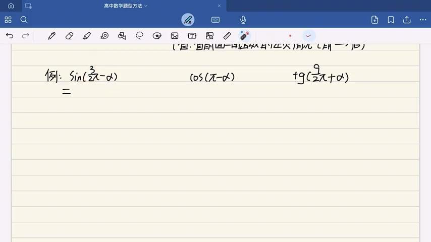 通过几个例子具体来看一下。sin 的二分之三π减阿尔法,cosπ减阿尔法,然后再来一个 tan 二分之九π减二阿尔法加二阿尔法。