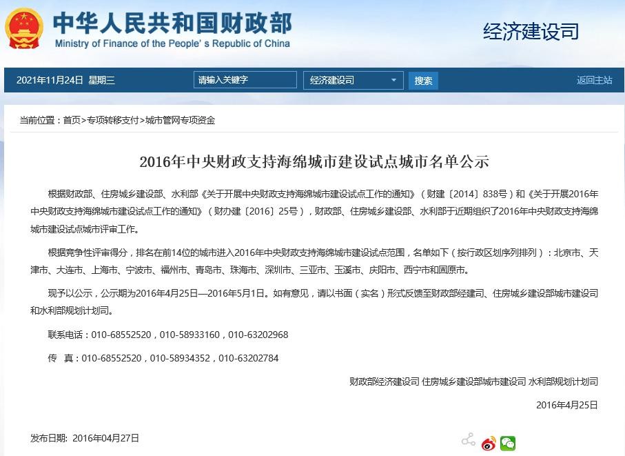 根据竞争性评审得分,排名在前14位的城市进入2016年中央财政支持海绵城市建设试点范围,名单如下(按行政区划序列排列):北京市、天津市、大连市、上海市、宁波市、福州市、青岛市、珠海市、深圳市、三亚市、玉溪市、庆阳市、西宁市和固原市。(2016年)