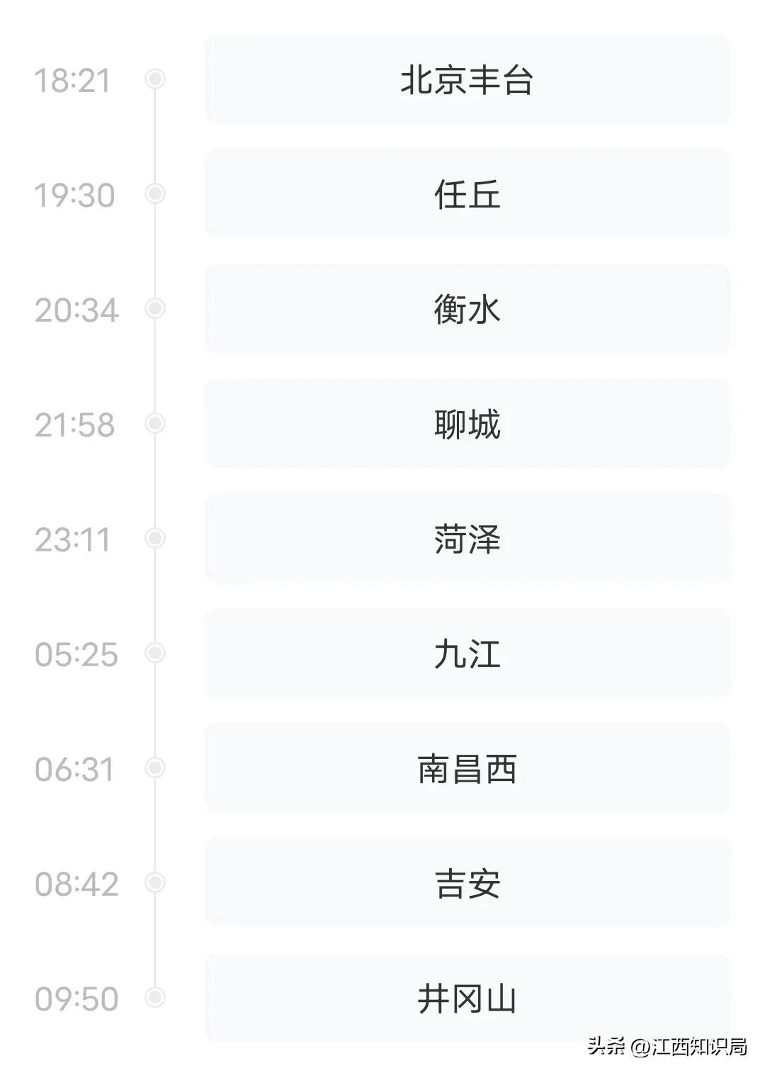 D733次由北京丰台站始发,终到井冈山站,全程1641公里,睡一夜就能到江西。该车18:21从北京丰台发车,23:14菏泽发车后夜间不停沿京九铁路南下,一共停靠9个站点,夜间尽可能少停站,以减少人员流动,第二日清晨即到达九江、南昌西、吉安、井冈山,满满的红色旅游资源。