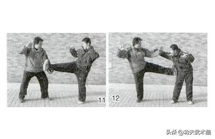 双方对峙,对手突用右蹬腿攻踢我胸腹部。我快动应变,上体向右转用左手臂向里抄挂破化来腿。对手随落步连发右摆拳攻打我头部,我疾用左手向外挡化来拳,同时发左蹬腿狠踢其侧肋(图11、12)。