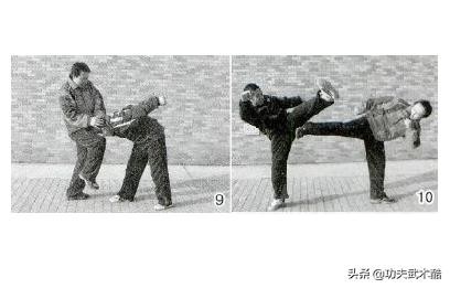 双方对峙,对手突然进步,俯身用头狠撞我胸部。我急速变招,发双手搂颈撞膝攻击对手头部,使之造成重伤 (图9)。