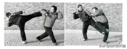 双方对峙,对手突发左低侧踹腿攻踢我右前小腿。我快变应动,上提右膝闪化来腿,同时身体右侧倾,发右反背拳狠击对手面门,左手回护腋下(图2)。