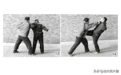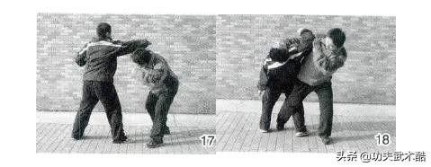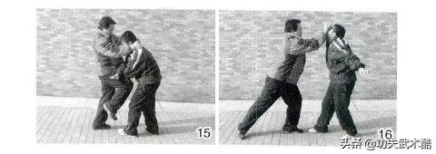 双方对峙,我突进身搂颈撞膝攻击对手心腹,对手遂用双手向下破化。我接着落步,双手变拳向前翻肘,用拳背反打其面门,致其重伤(图15、16)。