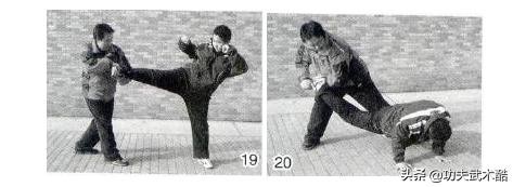 双方对峙,对手突发左侧踹腿攻踢我胸部。我快动应变,用双手接抱来腿并向回拉,同时向左转身用右腿支别对手的支撑腿,使之失衡倒地,致其重伤(图19、20)。