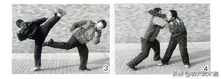 双方对峙,对手突用外摆腿攻踢我头部。我快变应动,身体向后移闪,同时发右后撩腿狠踢对手裆部,双手协动 (图3)。