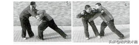 双方对峙,对手突然上步用双砍掌攻击我头颈两侧。我快动应变,用双手臂外侧阻挡来掌,且向外缠抓其左右手臂并向下拉,同时发头撞击向前狠顶对手胸部(图5)。