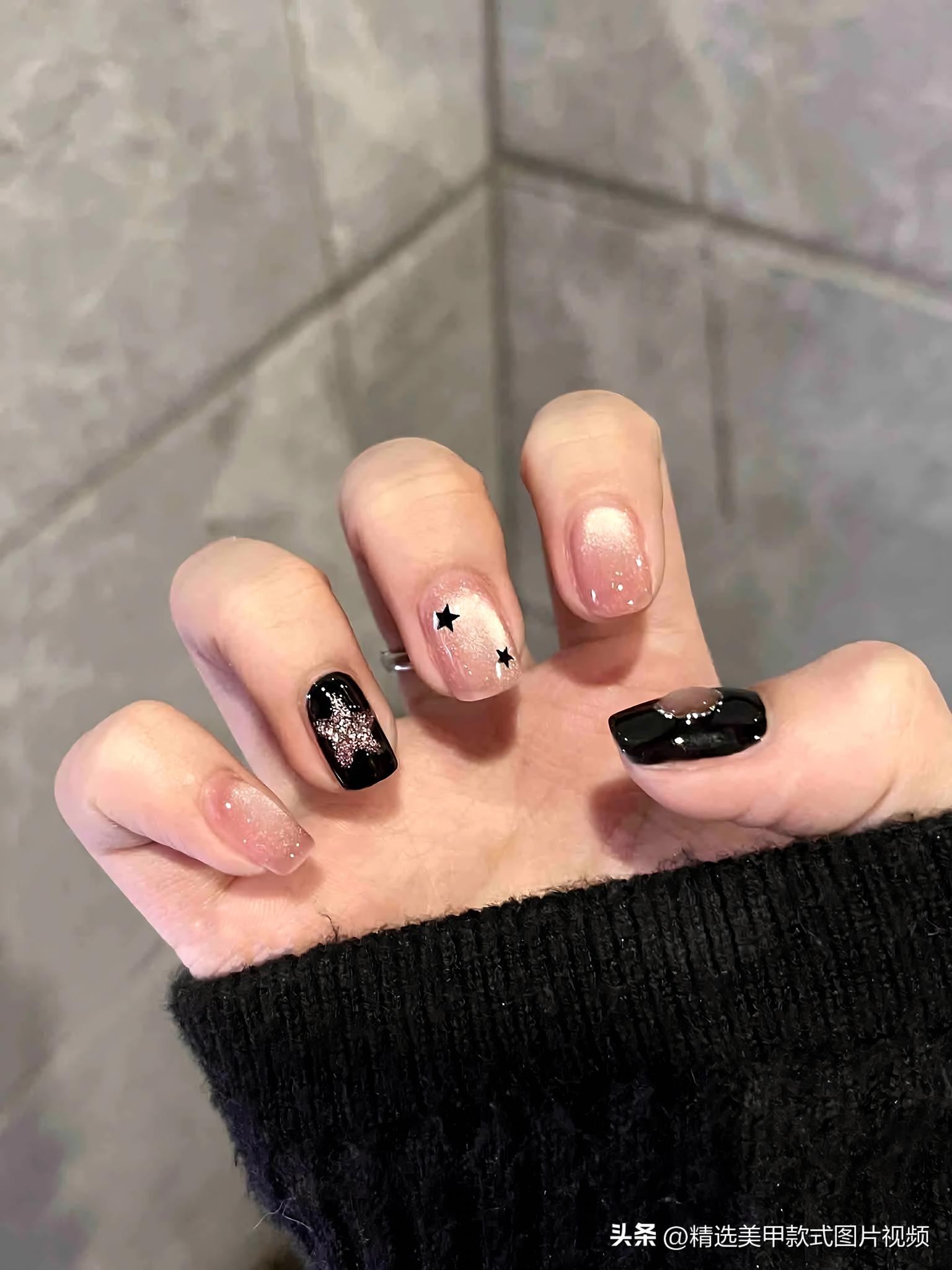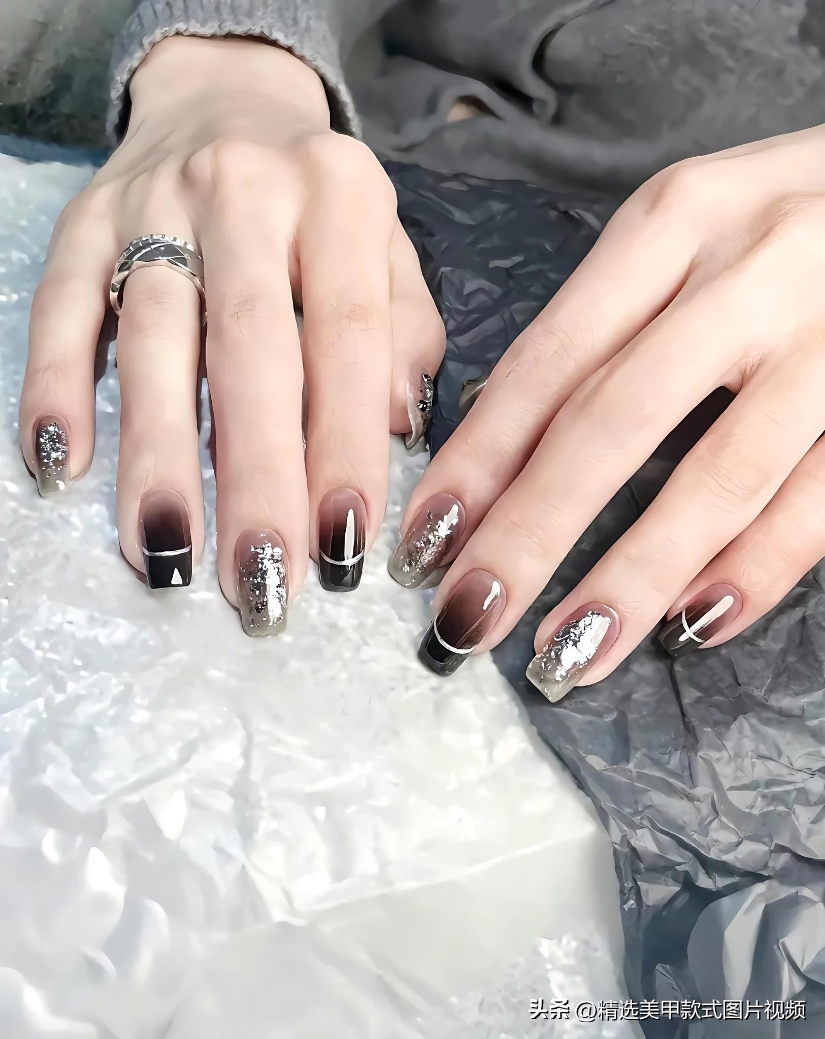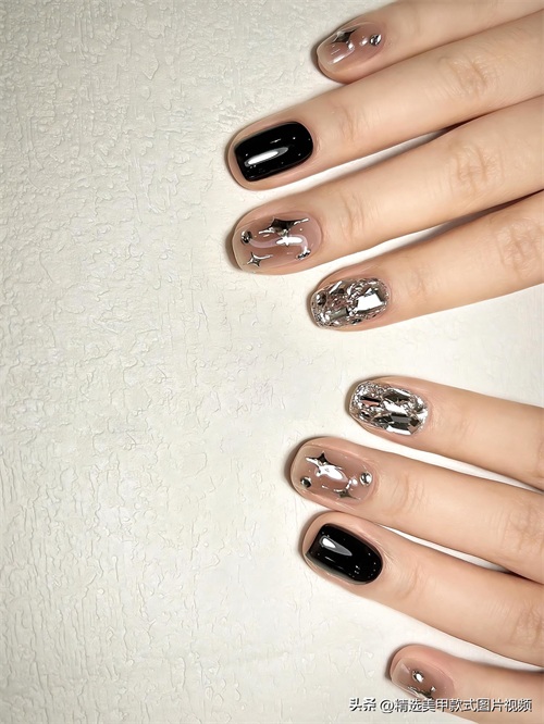 还有黑色晕染美甲,恰似一幅抽象的艺术杰作。借由将黑色与其他深色系,诸如深灰色、深蓝色等予以晕染交融,构筑出一种朦胧且神秘的氛围。不同的颜色于指甲上自然地过渡,每一片指甲皆独一无二,仿若艺术家精心雕琢的作品。“黑色晕染美甲”“艺术美甲” 备受瞩目,与简约的黑色连衣裙相搭,尽展优雅与高级之态。