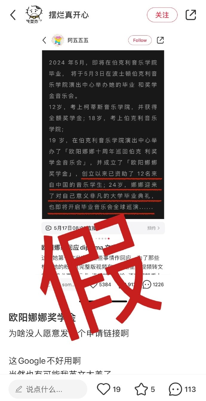 此前,欧阳娜娜发文宣布从美国著名音乐学院伯克利毕业,随后被网友曝出她没有获得学士学位,只有毕业证书。
