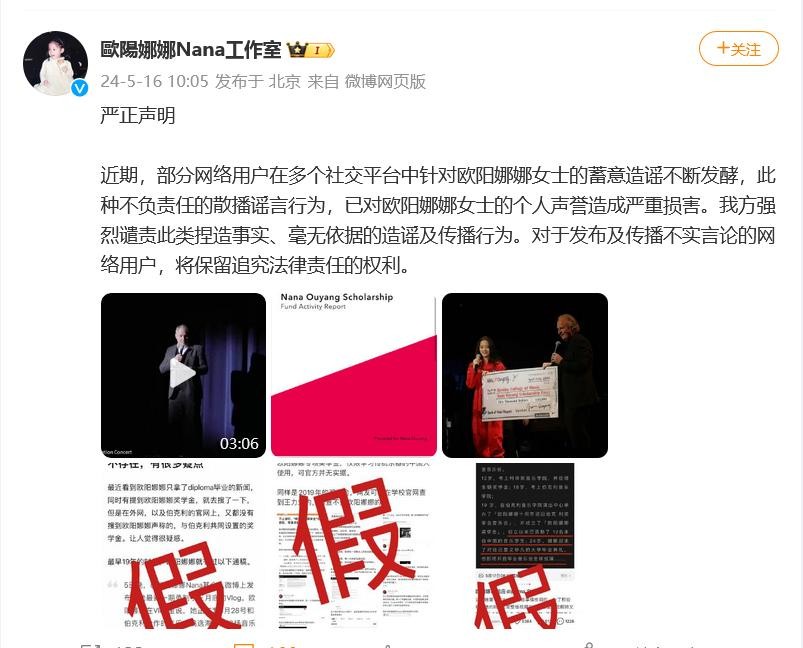 欧阳娜娜工作室晒出现场视频、合照以及相关文件辟谣打假,称此散播谣言的行为严重损害欧阳娜娜的声誉,对于发布及传播不实言论的网络用户,将保留追究法律责任的权利。