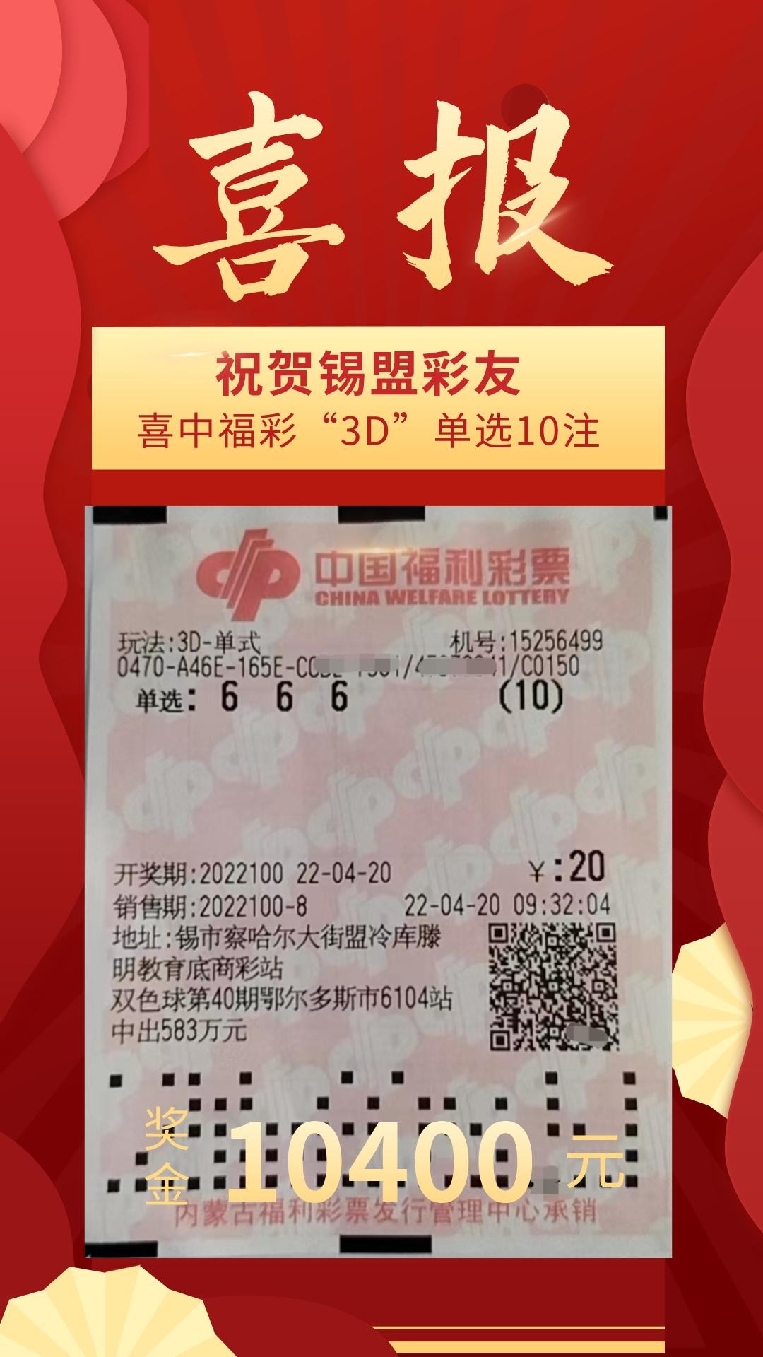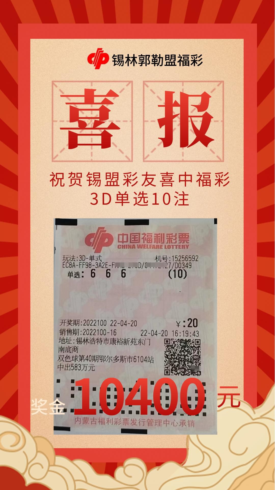 2022年4月20日晚,福彩3D游戏第2022100期开奖,中奖号码“666”。近日,大奖得主齐先生(化姓)来到锡盟福彩中心兑领了奖金10400元。