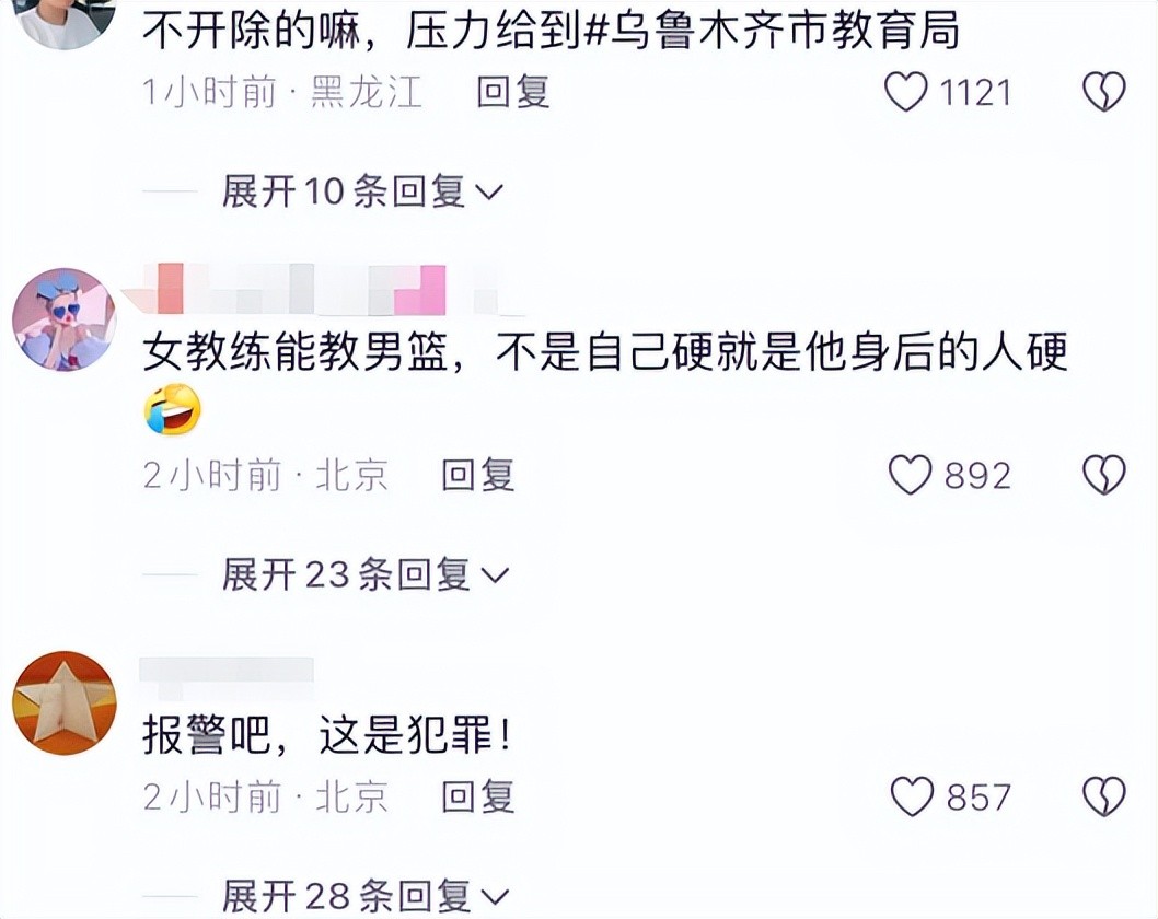 有网友愤愤不平的说:不开除的吗,压力给到乌鲁木齐市教育局。对于这种严重的体罚行为,网友认为仅仅记过处分是不够的,应该给予更严厉的处罚。还有网友道:女教练能教男篮,不是自己硬就是他身后的人硬。这种玩笑话反映了大家对事件背后的复杂背景的猜测。