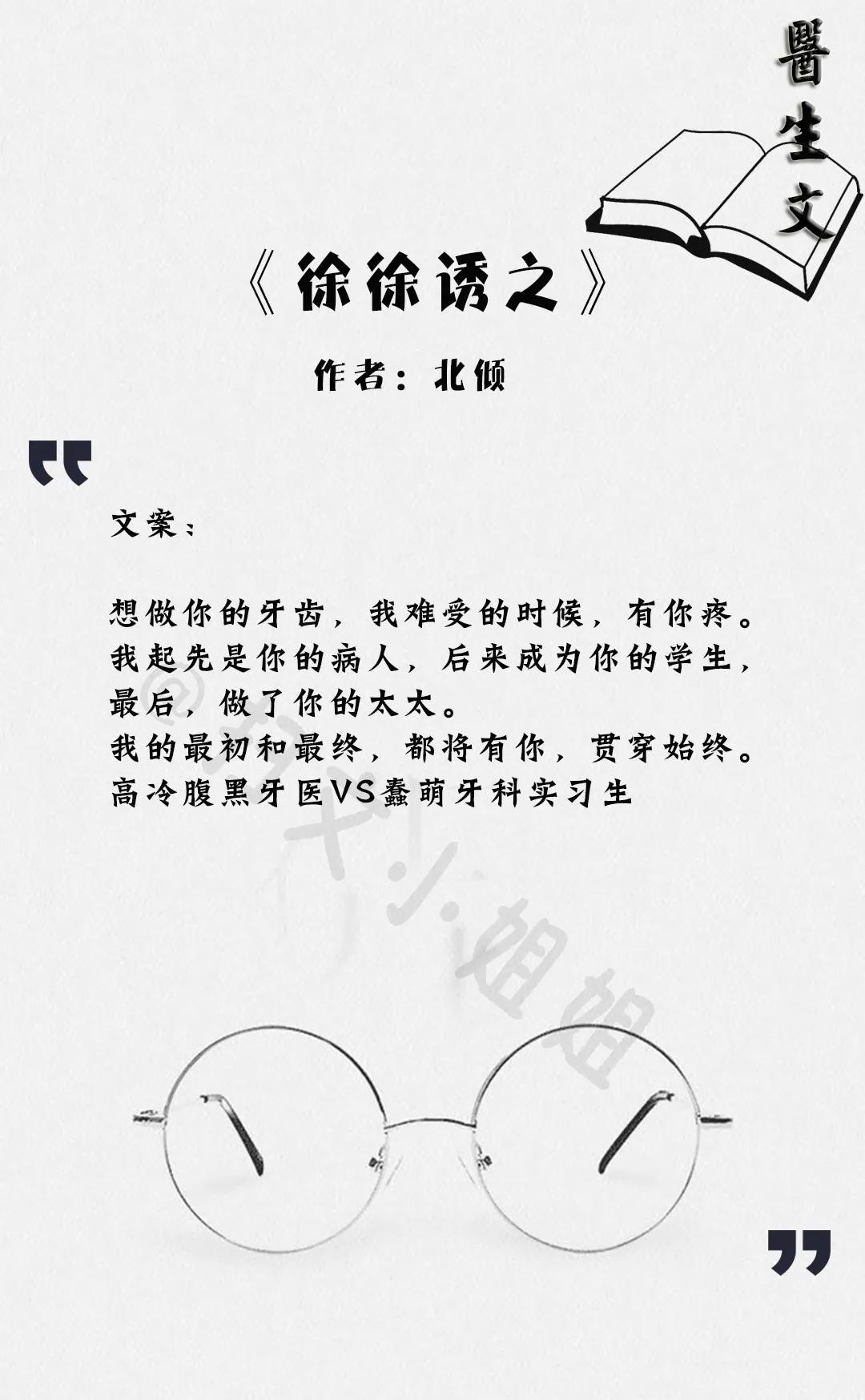 北倾的《徐徐诱之》看过好多遍了!蠢萌牙科实习生vs高冷腹黑牙医,就是一个聪明腹黑的大灰狼慢慢把小白兔拐到自己身边的故事。男主,沉稳专业深情。两人相遇在女主高中的时候,女主表白了,男主以女主太小拒绝了!后来女主做了男主的实习生,男主一眼就认出了女主,再后来么,女主做了男主的太太,这部小说太甜蜜了,甜的人想谈恋爱!