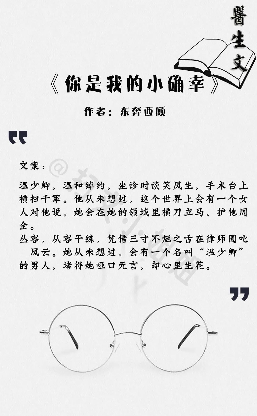东奔西顾的《你是我的小确幸》,我可太吃这种又撩又骚又温柔的男主了!律师医生配一脸,内容幽默有梗,超级好看的甜宠文。算是一见钟情,互相暗恋了好几年,因为现实原因没有碰面,各自工作稳定后再遇见。男主预谋的住在了女主对门,然后近水楼台慢慢渗透女主。女主是个隐藏吃货,而男主又很擅长厨艺,很容易就把女主骗走啦!男主温柔又撩人,看似温润如玉实则腹黑流氓,附带一点毒舌技能,爱了爱了!