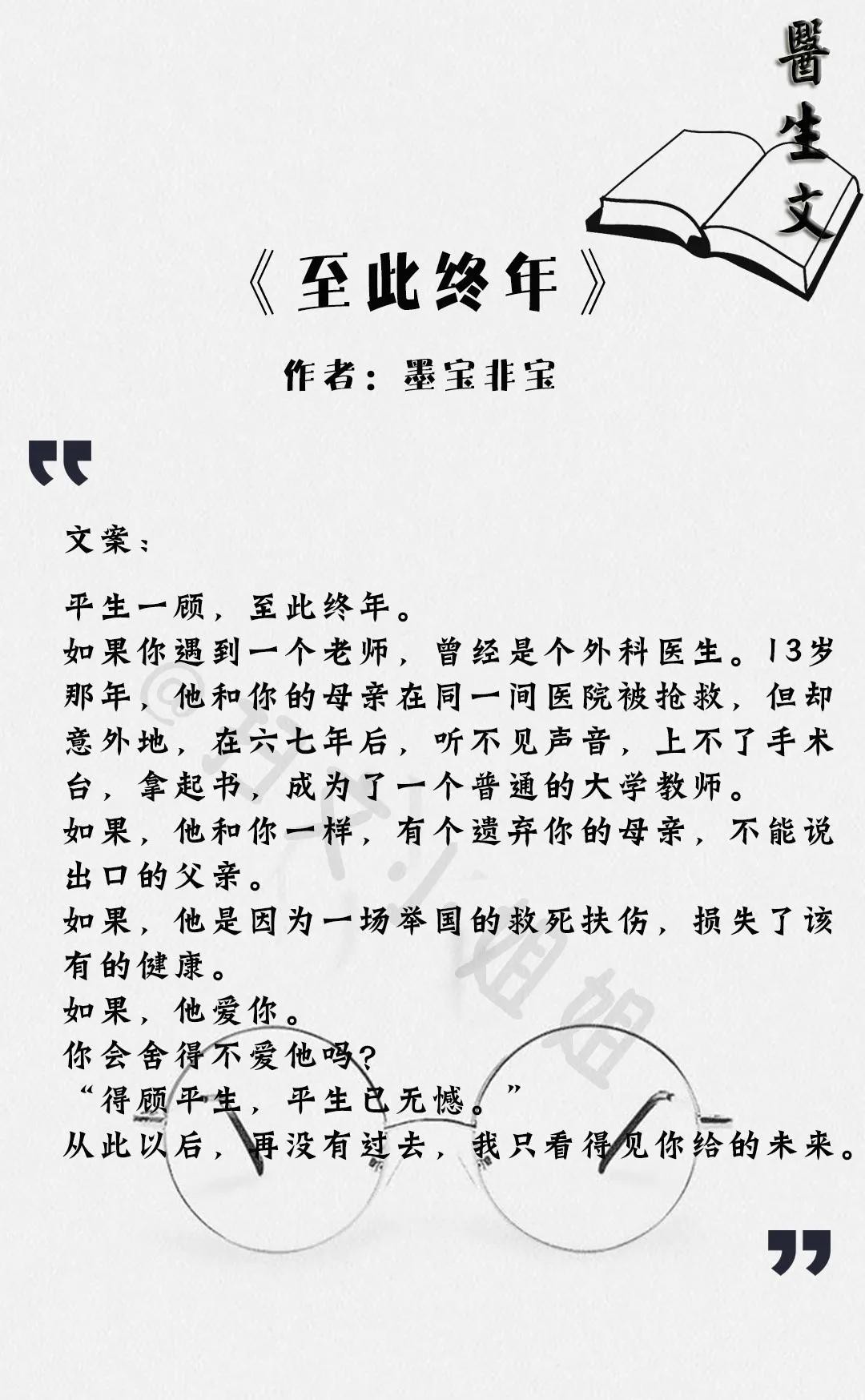墨宝非宝的《至此终年》,柏林石匠的《写给医生的报告》,福禄丸子的《医不可攀》都别错过,语言流畅,故事有趣,强烈推荐!