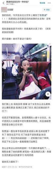 有名网友6日在微博分享偶遇明星的经验,表示自己一上公车时,就看到了一个很面熟的女生,仔细端详后确认是陈意涵,“我激动得不行!但是不敢冒犯她”,该网友更表示她途中一直用手机练英语,直到她要下车了,自己才鼓起勇气询问,想不到陈意涵也大方承认自己的身分,还亲切地说再见,让该名网友开心不已,更大赞:”被她实力圈粉了!”