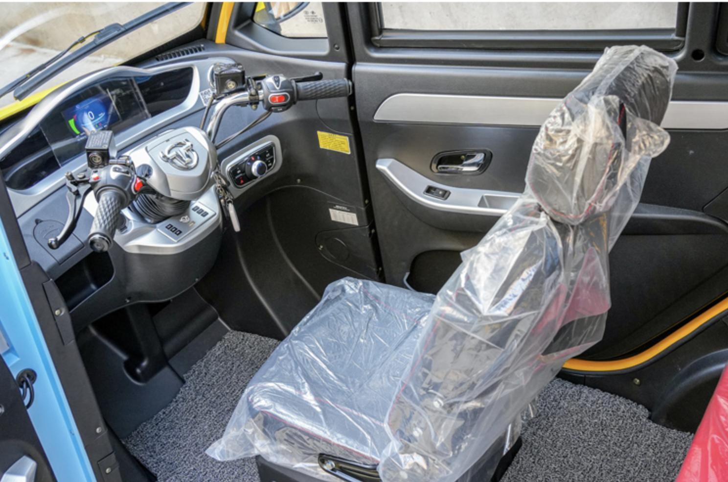 这款车采用了汽车级的驾驶舱,1+2的沙发座椅布局,拥有轮式和把式方向盘两种,操控更加简单。整车配置了独立的倒车影像大屏幕,倒车的时候更安全。车身长度为2.2米左右,倒车入库的时候也非常简单。一个标准车位可以停2台。另外,它的续航也有80公里左右。