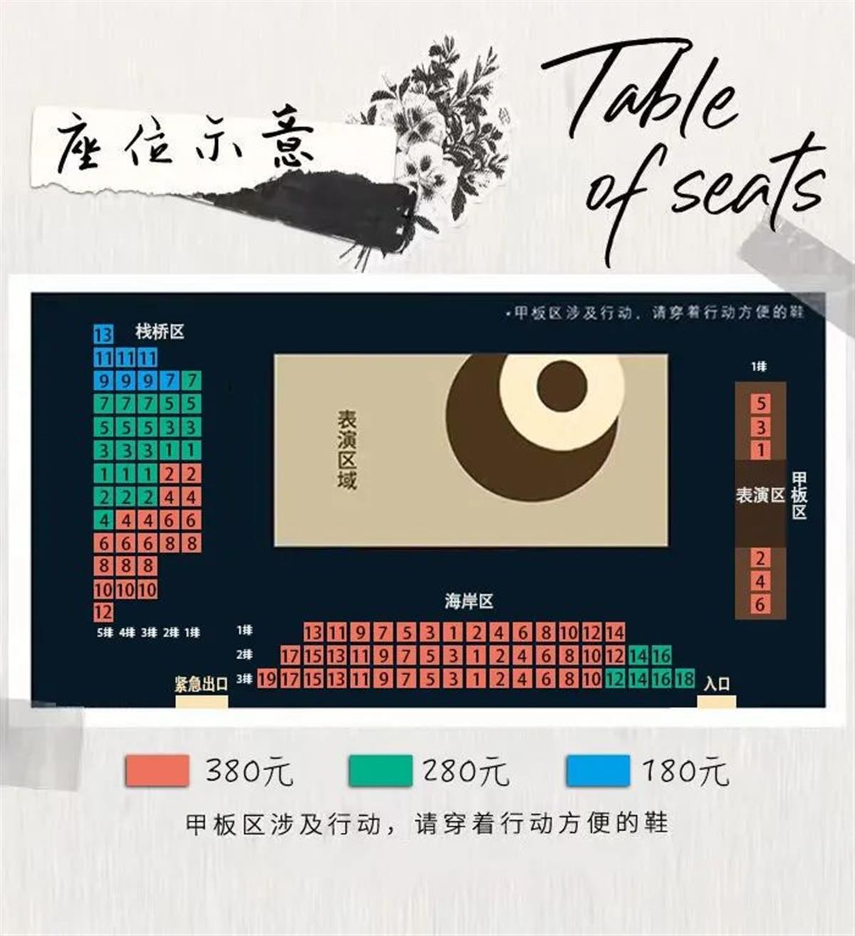 今年暑期在武汉剧院小剧场欣赏到《一丈青》的观众应该可以想象这种感觉。环境式音乐剧《灯塔》也将通过与舞台紧密连接的座位,让每一位观众不管位置如何,都可以真实地参与到《灯塔》剧情发展中来。在极目新闻记者看到的票图中,观众席将围绕舞台分为“栈桥区”“海岸区”和“甲板区”,而“甲板区”特别提示“因涉及行动,请穿着行动方便的鞋”。