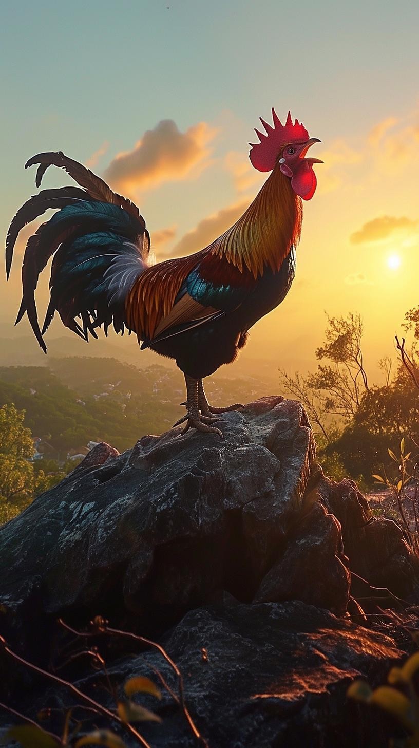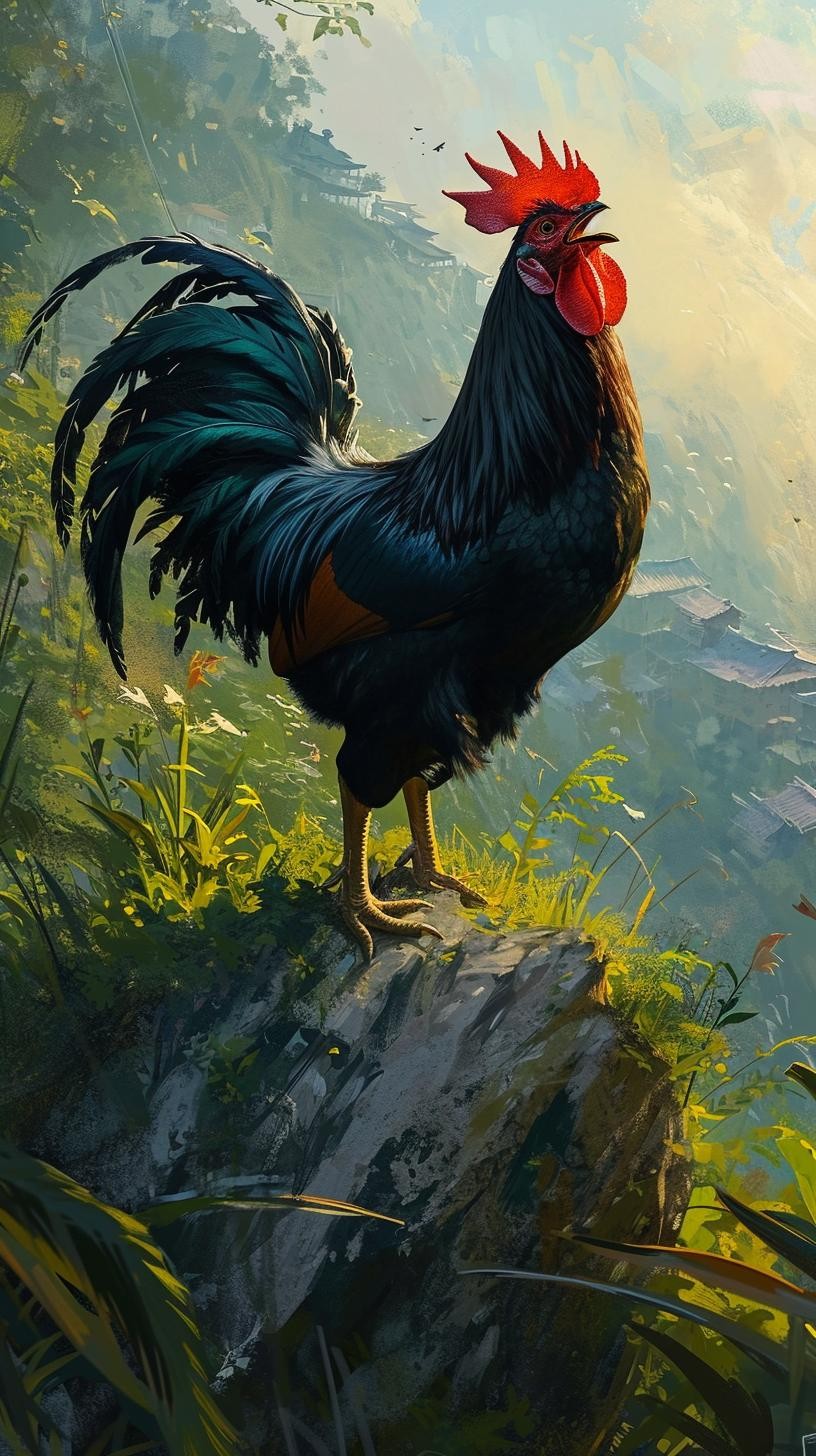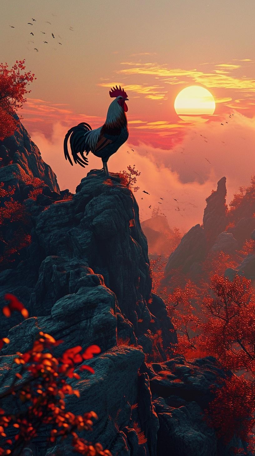这组大公鸡啼鸣的壁纸将大公鸡的场景变化也做的比较丰富,不再是单一的高山,红日。也和乡村场景进行了一定的带入,让大公鸡更符合乡村中的形象。