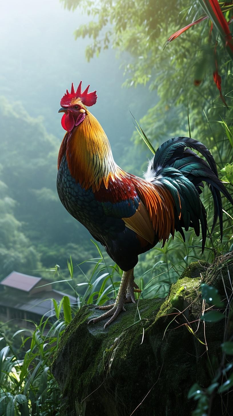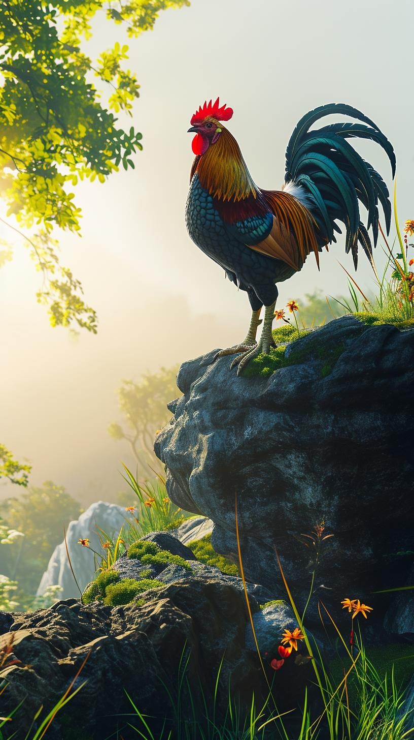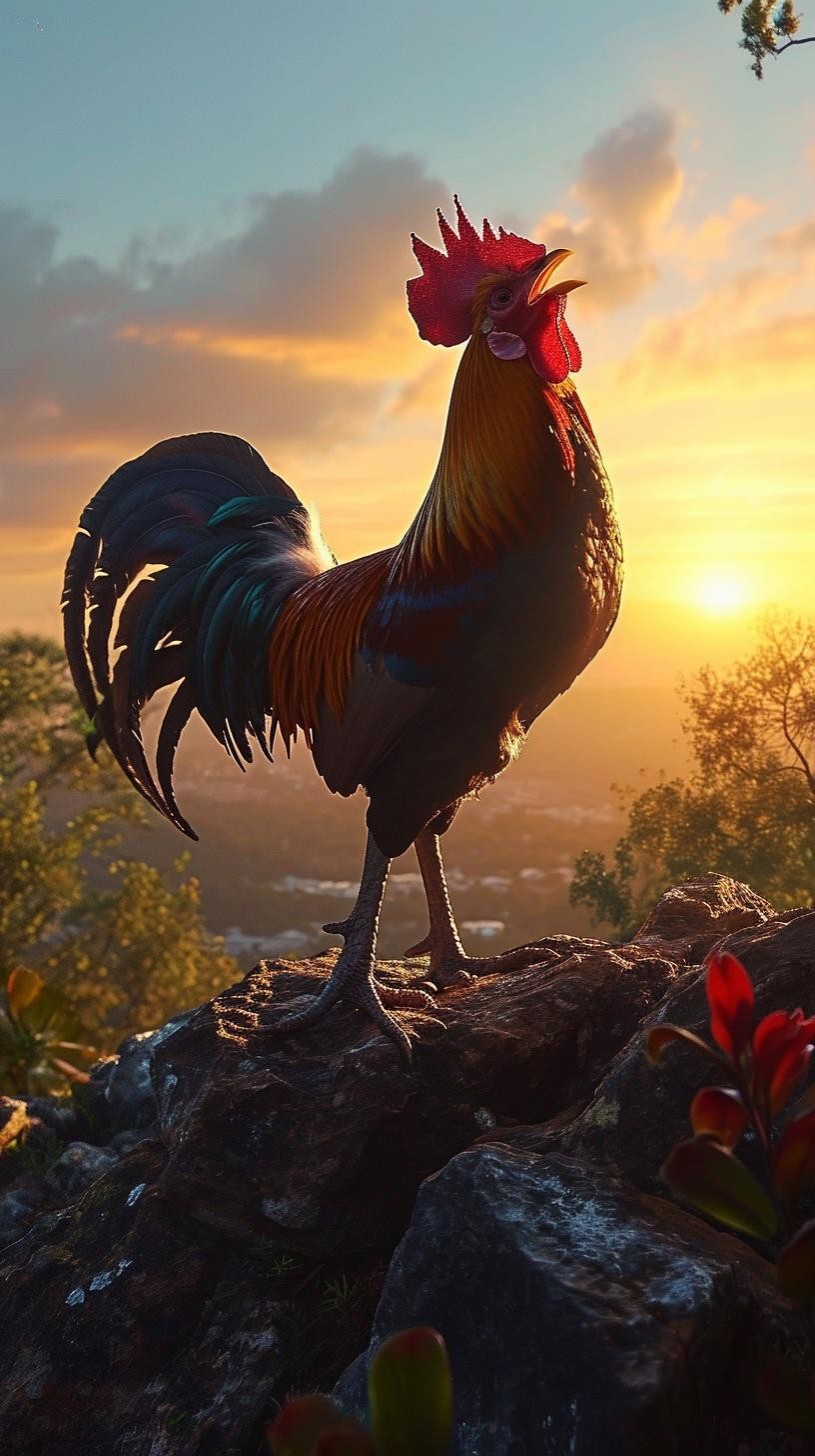 这组大公鸡啼鸣的壁纸将大公鸡的场景变化也做的比较丰富,不再是单一的高山,红日。也和乡村场景进行了一定的带入,让大公鸡更符合乡村中的形象。