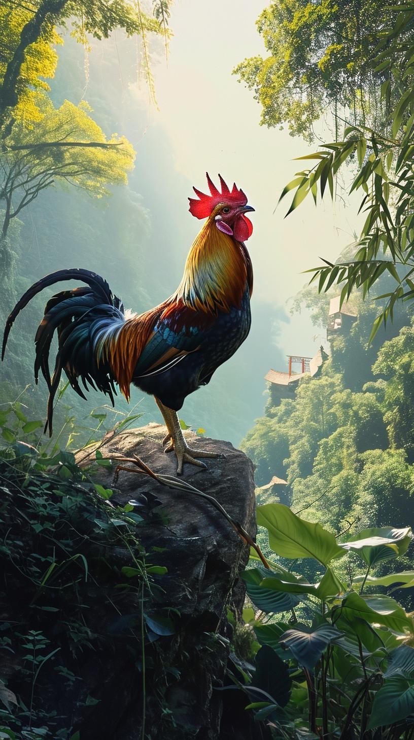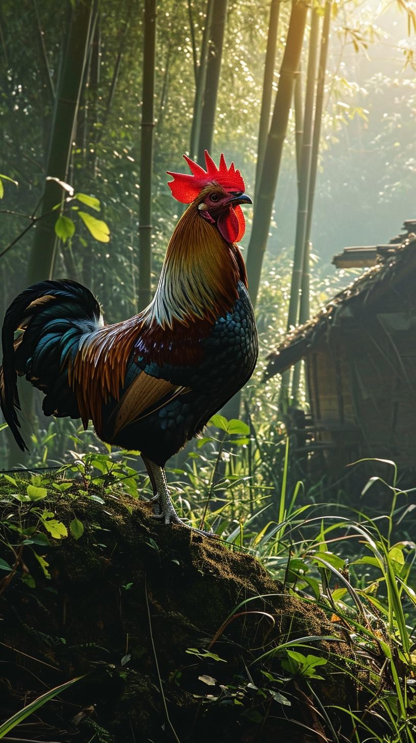金色的阳光勾勒出雄鸡的轮廓。鲜红的鸡冠,金色的羽毛,被阳光照耀得如金子一般。它的每一根羽毛又闪亮得像绸缎。这一刻的雄鸡,是一件精雕细刻的艺术品,而这样的艺术品,用AI可以轻松实现。